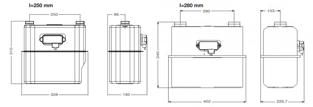 | Dimensions (MM G10) | A = 250 mm, B = 310 mm, C = 328 mm, D = 195 mm, E = 86 mm |